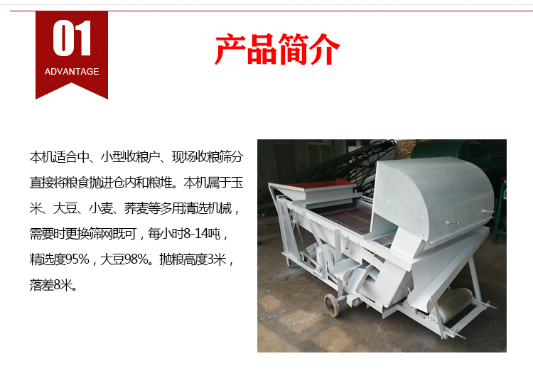 本機(jī)為三層篩網(wǎng),先經(jīng)過進(jìn)料口處風(fēng)機(jī)抽風(fēng),直接抽走重量輕的雜葉或麥秸稈,上層篩的初次篩分再把大雜清理過,好的糧食(種子)直接落到下層篩網(wǎng)上,下層篩網(wǎng)會(huì)把糧食(種子)中的小雜.小石子.有缺陷的糧食(種子)直接漏掉,完好的糧食(種子)會(huì)從出料口篩分出來。該小型清糧機(jī)解決了揚(yáng)場(chǎng)機(jī)的功能單一,不能有效去除石子.土塊的缺陷,更能為清理、凈選糧食(種子)帶來滿意的效果。該機(jī)有占地小,移動(dòng)方便,便以維修,除塵除雜效率明顯,能耗低,使用簡便等優(yōu)點(diǎn)。