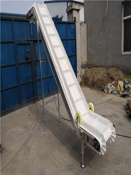 裙邊皮帶輸送機常用于輸送小型、顆粒或粉末狀產品,裙邊為熱熔在輸送帶兩側波浪起伏狀的帶狀皮帶護邊,為防止微小產品從皮帶縫隙掉落到皮帶輸送機內。